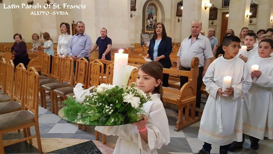 Az aleppói ferences templomban is újraindult az élet; május számukra is Mária hónapja: fénypontja a Fatimai Szűz ünnepe volt, melynek másnapján a gyermekek elsőáldozását ünnepelte a közösség. Plébánosuk, a damaszkuszi születésű Ibrahim Alszábag ferences szerzetes a városban maradt a háború idején, hívei mellett – a szentföldi kusztódia 2015 júliusában a hónap emberének választotta.