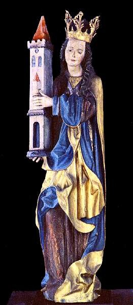 Borbála a jó halál, a bányászok, kohászok, tüzérek, tűzszerészek, ágyú- és harangöntők, a várak, erődök védőszentje, akit pálmaággal, toronnyal, kehellyel, könyvvel szoktak megörökíteni. A középkori városok puskaporos tornyát gyakran nevezték el Szent Borbáláról, hogy a szent segítsen megóvni a veszélyes anyagot a felrobbanástól.